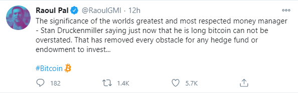 Рауль Пал, еще один евангелист биткоина, тоже считает, что мнение Стэна Дракенмиллера, одного из самых уважаемых управляющих капиталом, нельзя недооценивать. По его словам, теперь любой хедж-фонд может без опаски вкладываться в криптовалюту.