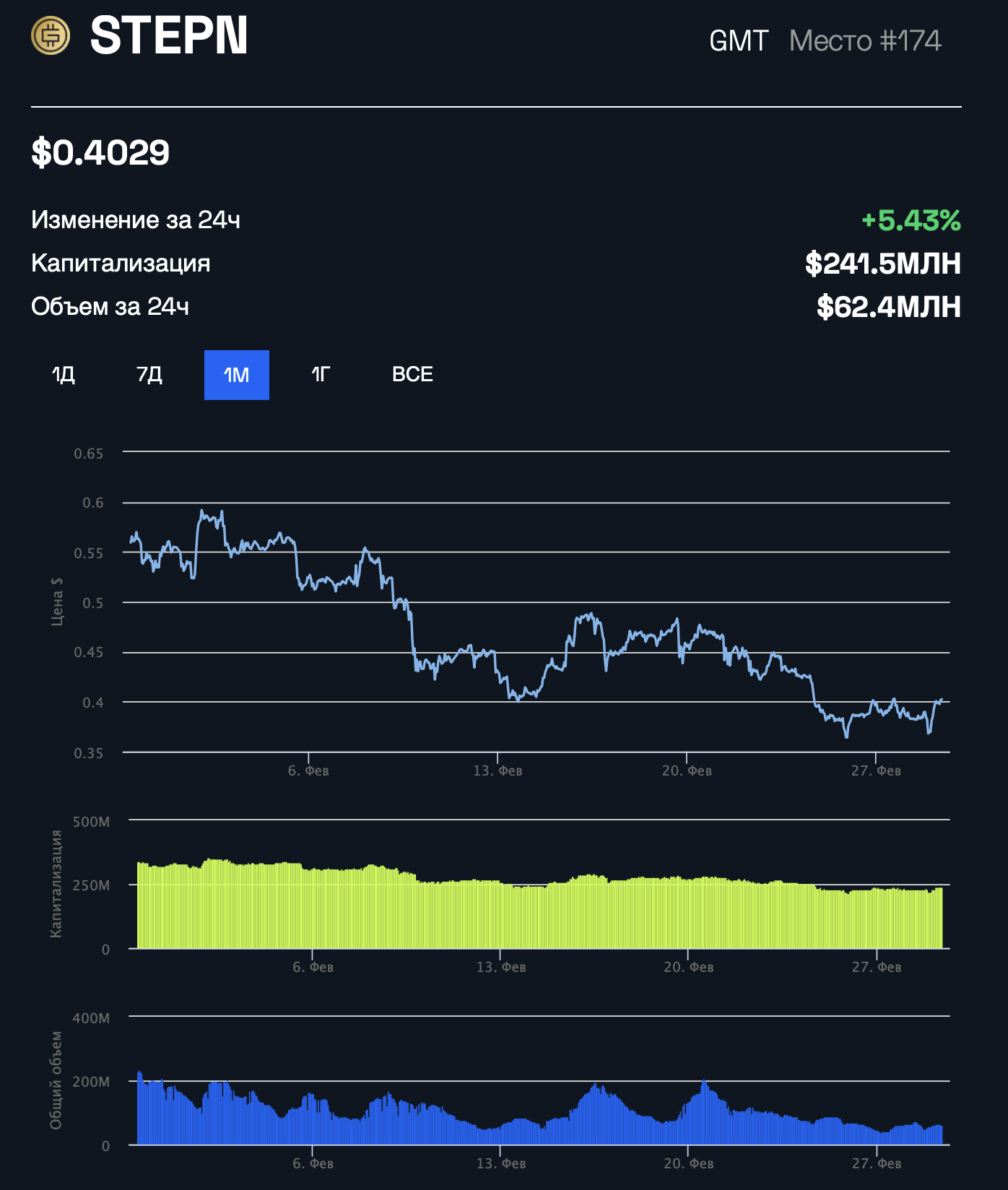 За прошедшие 24 часа GMT подорожал на 5,43% и на момент публикации торгуется на отметке $0,4029. Однако цена токена все еще находится в нисходящем канале. По сравнению с достигнутым в апреле 2022 года историческим максимумом в $4,11 она упала на 90%.