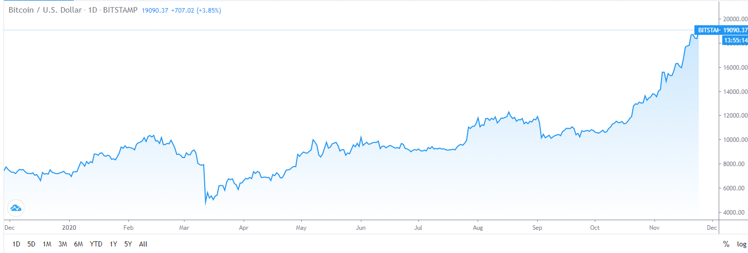 Во вторник, 24 ноября, биткоину удалось преодолеть порог в $19 000 впервые с декабря 2017 года. На момент написания материала наибольший курс замечен на бирже ByBit ($19 125).