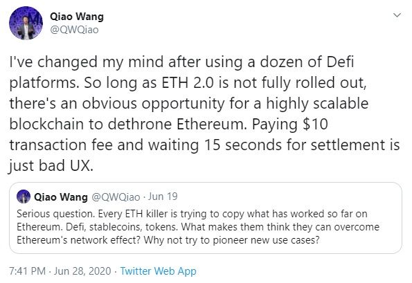 «Я передумал после использования дюжины платформ Defi. Пока ETH 2.0 не развернут полностью, есть очевидная возможность для высокомасштабируемого блокчейна свергнуть Ethereum. Плата за транзакцию в размере 10 долларов и ожидание расчета в течение 15 секунд – это просто плохой UX », – сообщил он на своей странице в Twitter.