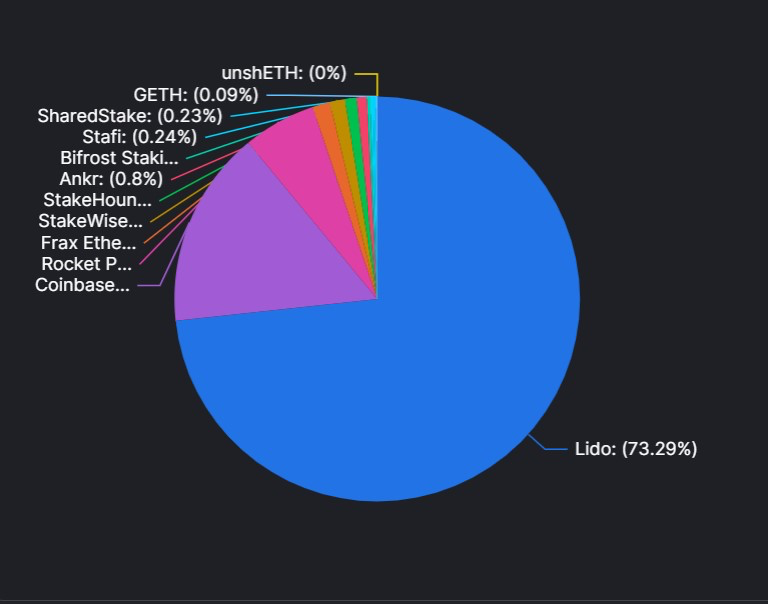 Крупнейшим игроком сегмента по-прежнему остается платформа Lido Finance, на долю которой приходится более 70% заблокированных Ethereum стоимостью $8,7 млрд. Coinbase занимает второе место с 1,1 млн монет, а протоколы RocketPool и Frax Ether в совокупности насчитывают около 500 000 ETH.