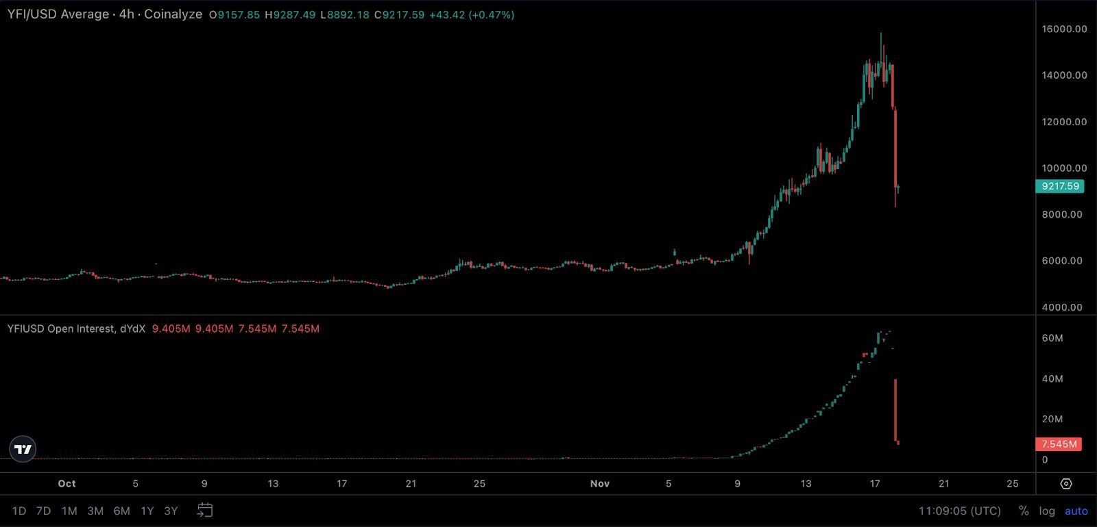 Напомним, 17 ноября стоимость YFI провалилась более чем на 40%. Все это привело к массовым ликвидациям коротких и длинных позиций.