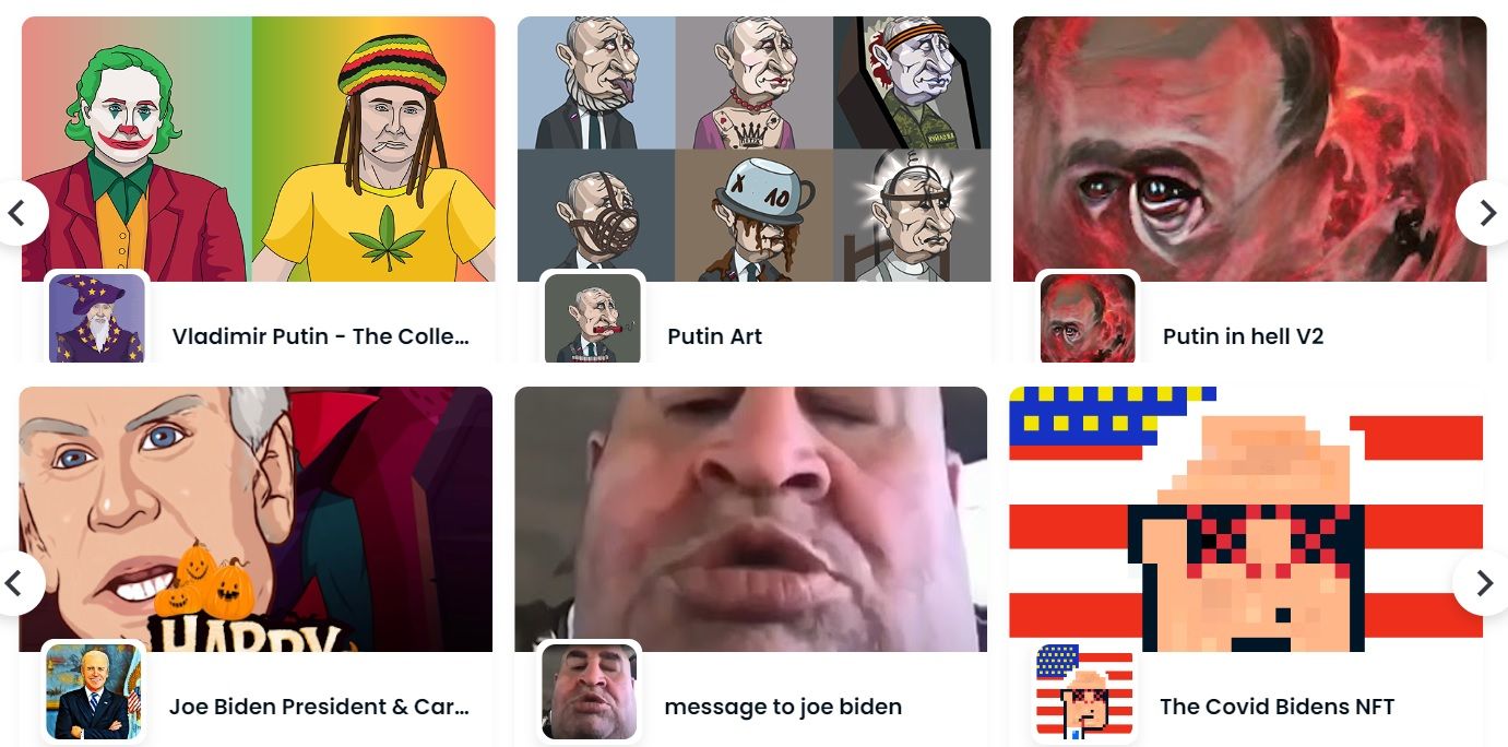 Для многих участников криптосообщества OpenSea стала платформой для выражения своей политической позиции через творчество. В стенах маркетплейса много коллекций и отдельных NFT-артов, посвященных действиям властей. В том числе, на OpenSea масса работ, авторы которых высмеивают политических деятелей.