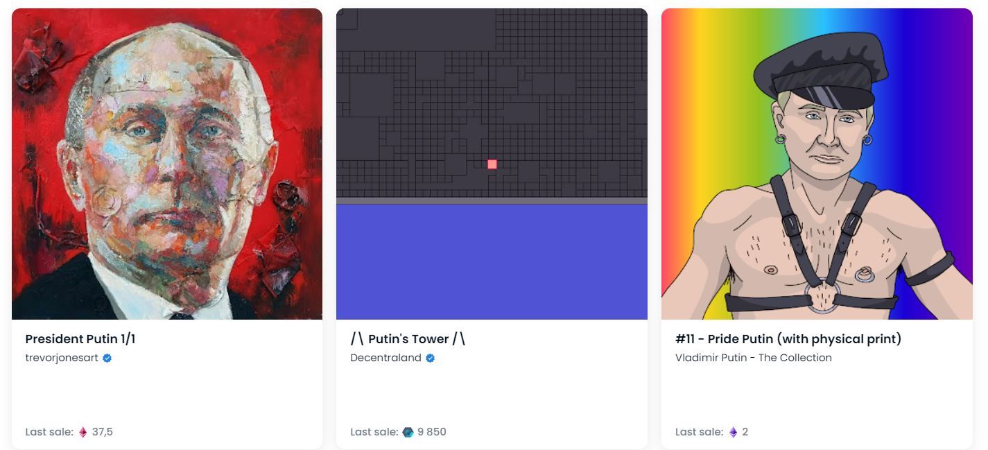 Ценник на политизированные арты стартует от нескольких долларов. Некоторые работы удается продать значительно дороже. Вот, например, как выглядят самые дорогие арты, из недавно проданных, по запросу «Путин». Примечательно, что одним из них стала цифровая недвижимость «Башня Путина» в метавселенной Decentraland.
