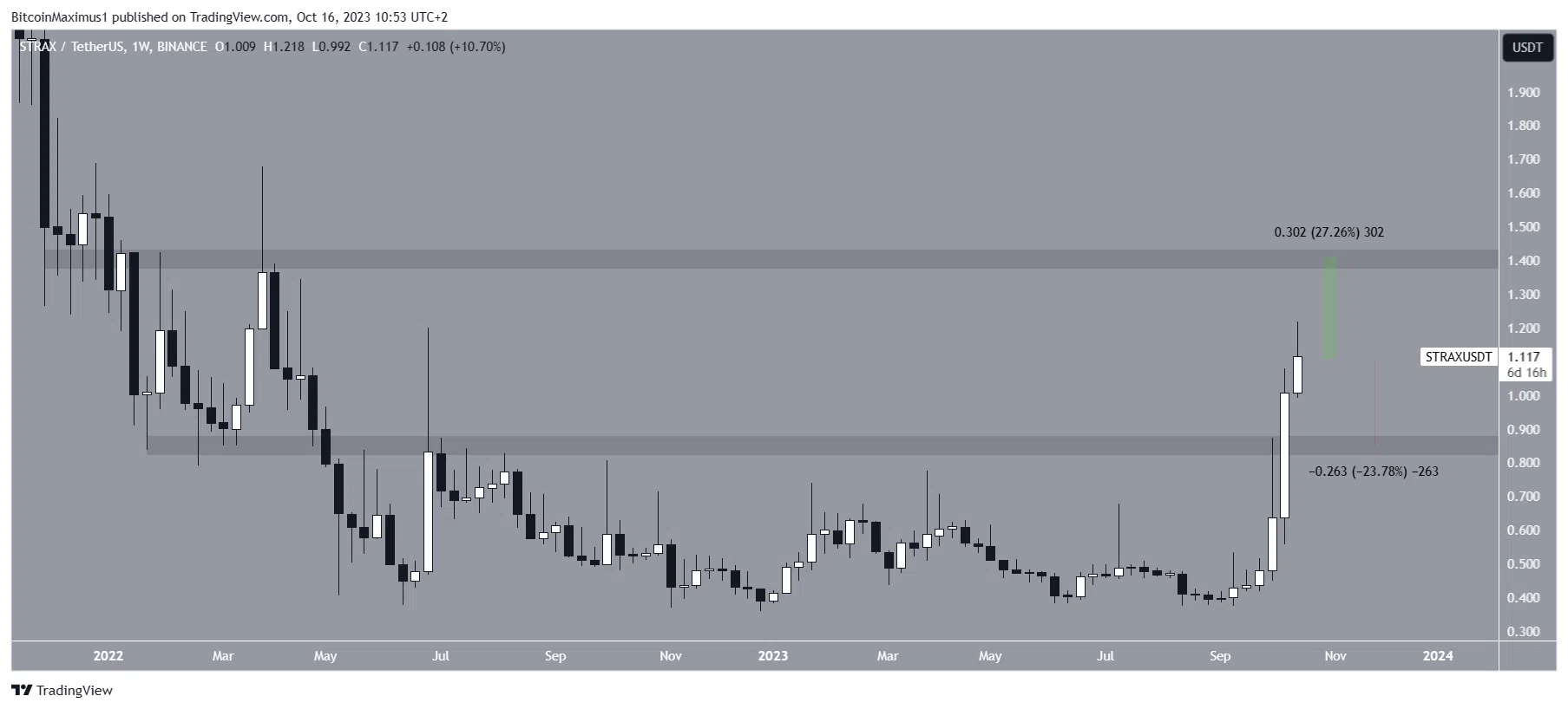 Если восходящее движение продолжится, STRAX может вырасти на 27% и достичь следующего ближайшего сопротивления на уровне $1,40. Однако внезапная потеря импульса и образование медвежьей свечи приведет к падению на 25% до горизонтальной области поддержки $0,85.