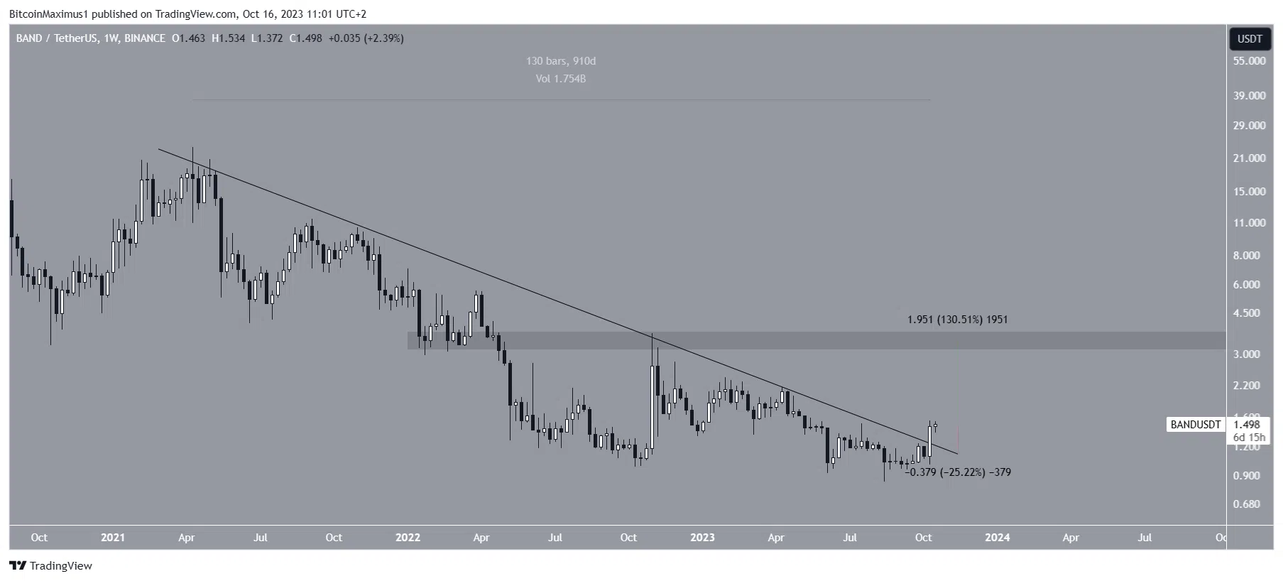 BAND опустился под нисходящую линию сопротивления после достижения исторического максимума в апреле 2021 года. В августе 2023 года цена актива просела до минимума в $0,85, отскочила и в результате прорвалась выше линии сопротивления, которая существовала 910 дней.