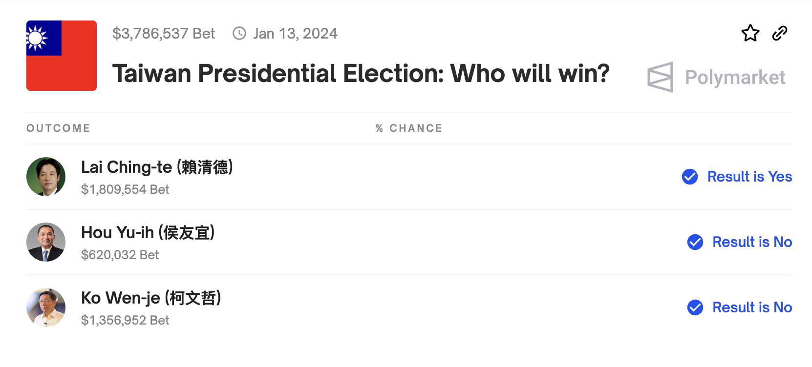 Сообщается, в преддверии президентских выборов в Тайване в январе этого года гражданин по фамилии Чэнь сделал ставки на результаты с помощью стейблкоина USDC на площадке Polymarket.