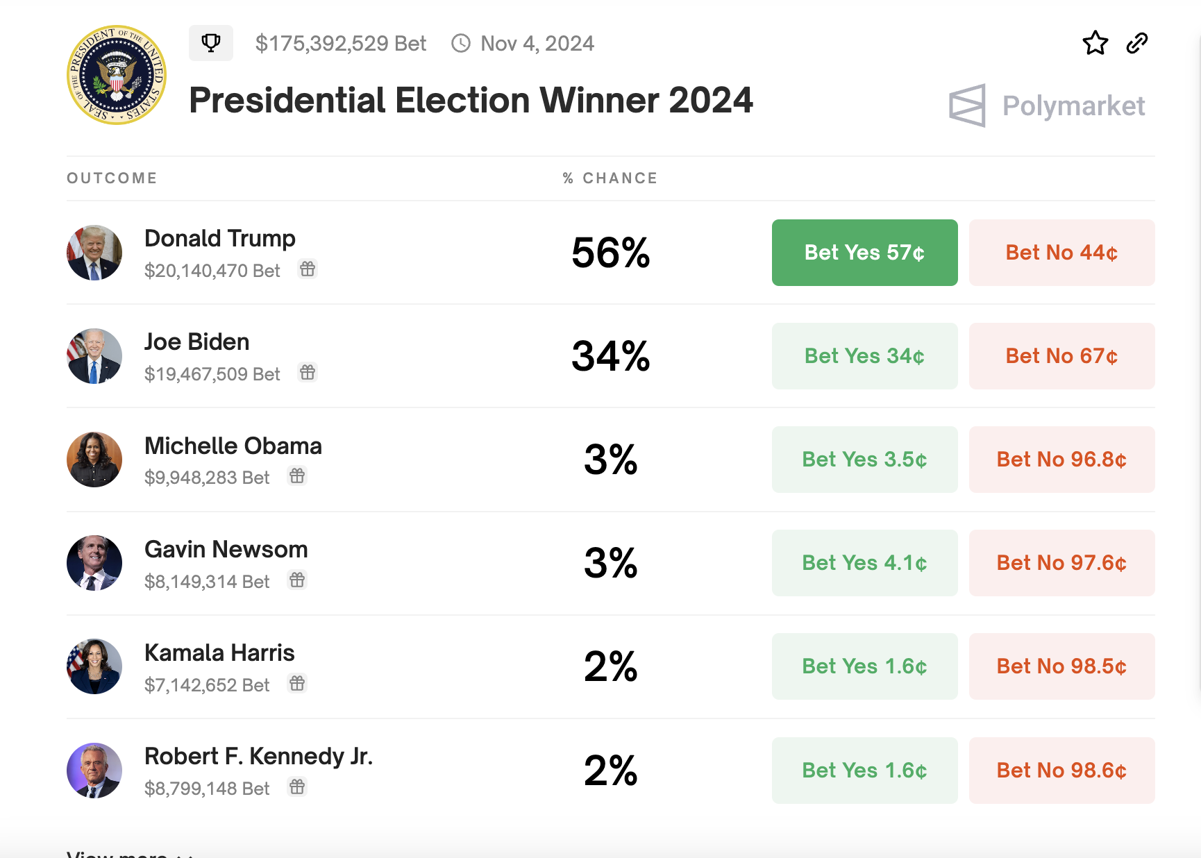 Сейчас одна из самых горячих тем на Polymarket — результаты выборов президента США, которые состоятся в ноябре этого года. Пользователи площадки оценивают шансы Дональда Трампа на 56%, а действующего главы Америки Джо Байдена — на 34%.