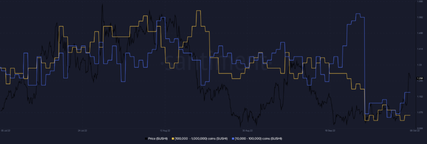 Также можно отметить рост количества адресов, на балансе которых хранятся от 10 тыс. до 100 тыс. токенов и от 100 тыс. до 1 млн токенов. При этом киты стали больше аккумулировать SUSHI.