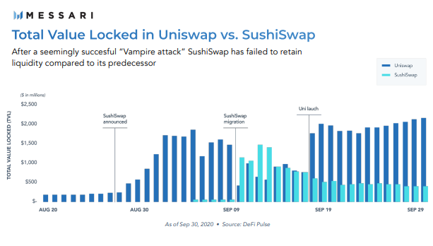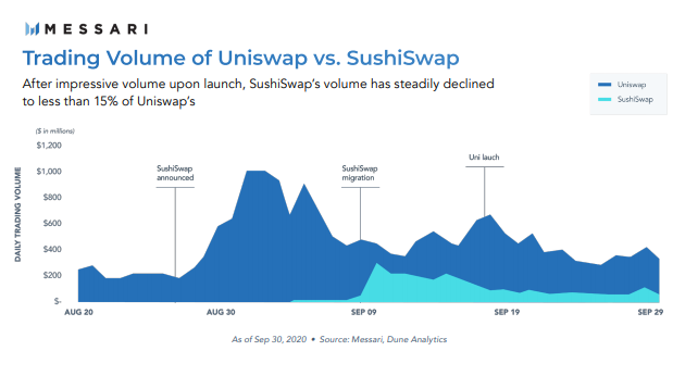 Несмотря на резкий рост объема в SushiSwap почти сразу после запуска, со временем ликвидность снизилась и теперь составляет всего 13% от Uniswap.