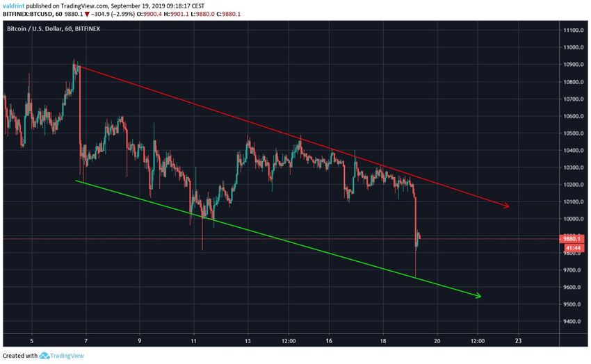 BTC вышел за пределы симметричного треугольника и торгуется внутри нисходящего канала. Наш анализ показывает анализ, что биткоин, скорее всего, не покинет пределов этого канала. Гипотетически, можно предположить, что BTC будет снижаться от области $10 000-$10 100.