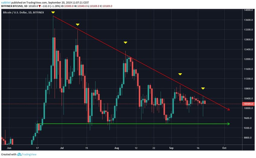 18 сентября биткоин коснулся максимума $10,276, откуда начал активно снижаться и достиг минимума $9655 на следующий день. Однако токен тут же развернулся и 19 сентября подскочил к максимуму $10,487. С тех пор BTC демонстрирует медвежий уклон.
