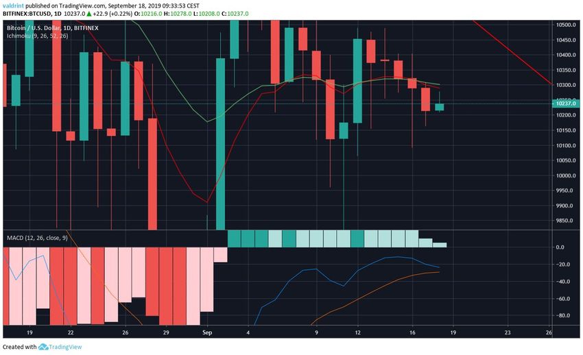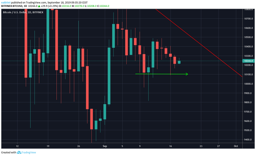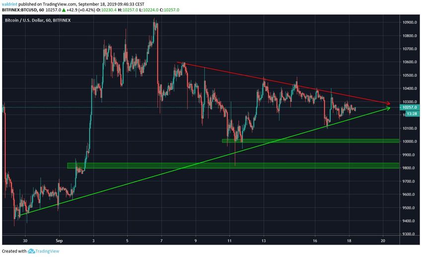30 августа BTC нащупал минимум $9080, откуда начал восходящее движение и 6 сентября достиг максимума $10,933. С тех пор цена снижается, торгуясь в тесном диапазоне $10,300-$10,000.