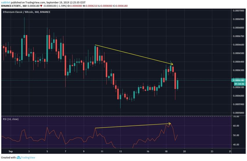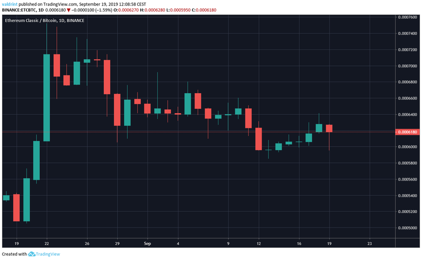 19 августа ETC достиг минимума 50,500 сатоши. В течение последующих трех дней цена уверенно росла. Коснувшись максимума 75,200 сатоши 22 августа, ETC перешел к снижению, которое продолжается по сей день.