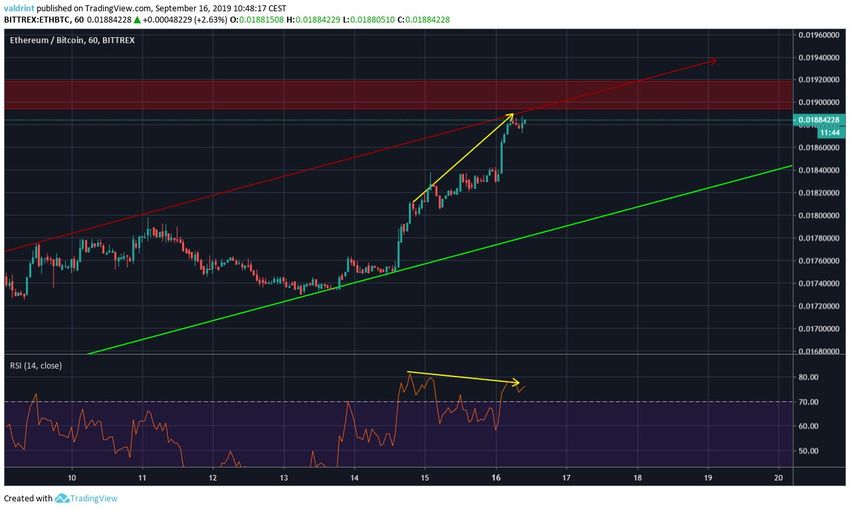 На том же временном графике также видно, что ETH приближается к важной области сопротивления, расположенной на ₿0.0191.