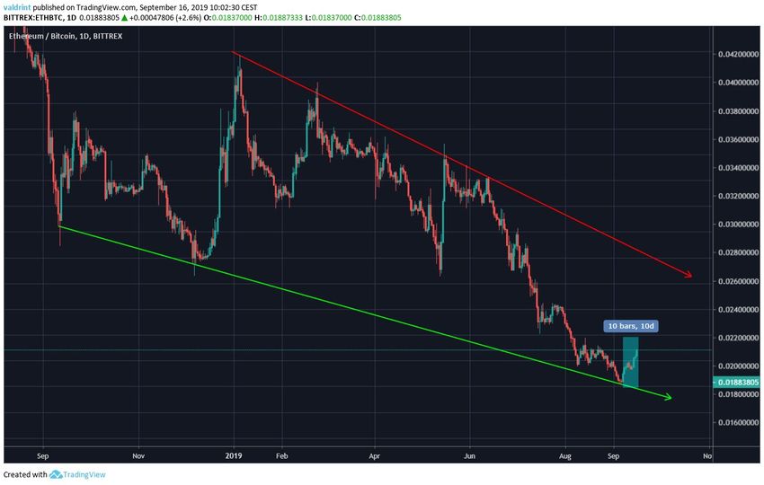 На дневных графиках видно, что Ethereum торгуется внутри нисходящей модели клин с сентября 2018 года.