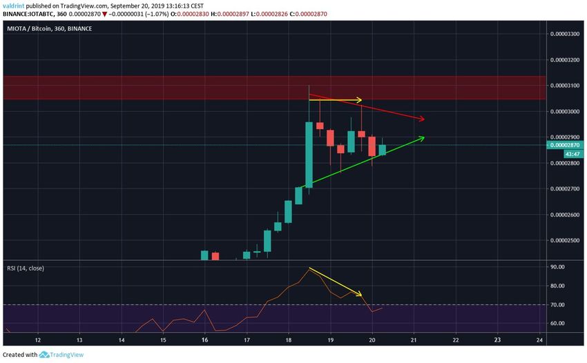 - IOTA/BTC торгуется внутри симметричного треугольника.