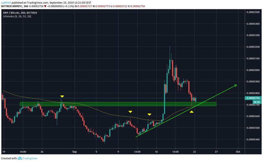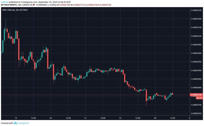 18 сентября 2019 года курс XRP отметил максимум на 3204 сатоши, после чего развернулся на юг, и это снижение продолжается до сих пор. 20 сентября XRP предпринял попытку роста, но она не увенчалась успехом, и 22 сентября валюта возобновила снижение, достигнув минимума на 2688 сатоши.
