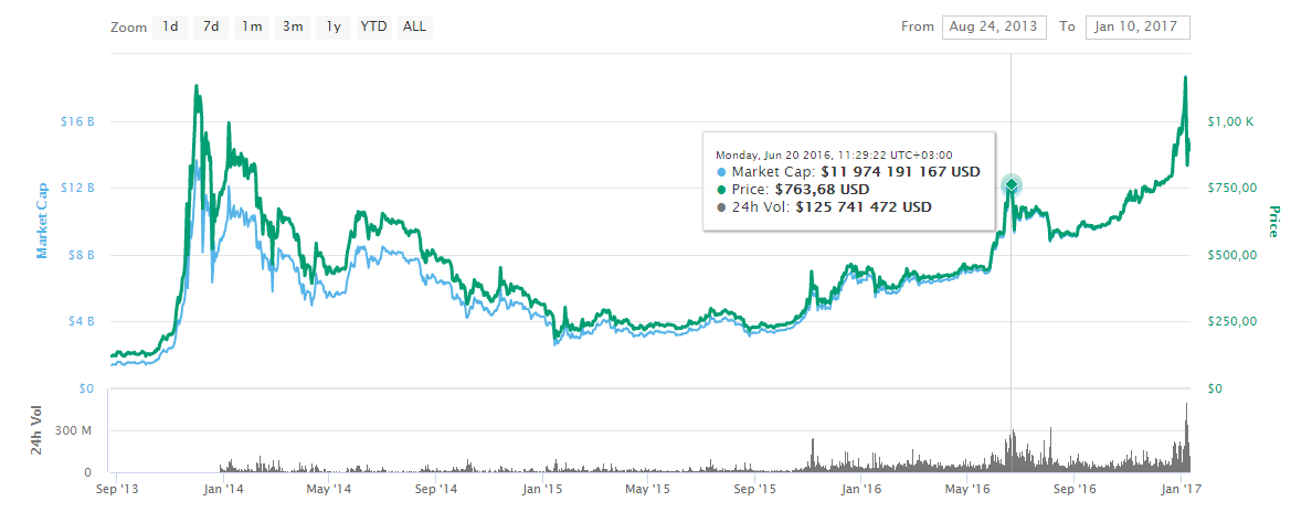 Примечательно, что тогда же цена биткоина резко обвалилась до усредненного значения в $250 и вернулась к отметке в $750 лишь спустя пару лет, в июне 2016 года.