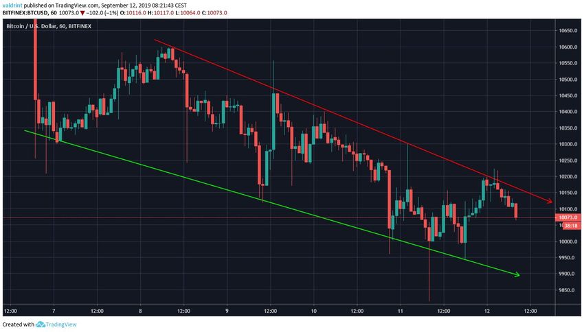 Анализ часового графика демонстрирует, что курс BTC с 7 сентября торгуется в русле нисходящего канала.