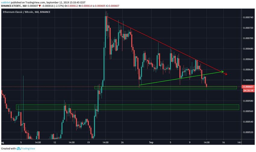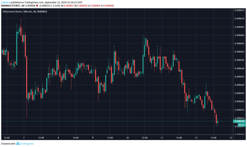 6 сентября 2019 года курс Ethereum Classic отметил максимум на 670,000 сатоши, после чего начал стремительное снижение. В тот же день цена достигла минимума на 626,000 сатоши и начала последовательный восходящий откат, завершившийся 10 сентября. Далее пара возобновила снижение и 12 сентября зарегистрировала понижающийся минимум на 605,000 сатоши.