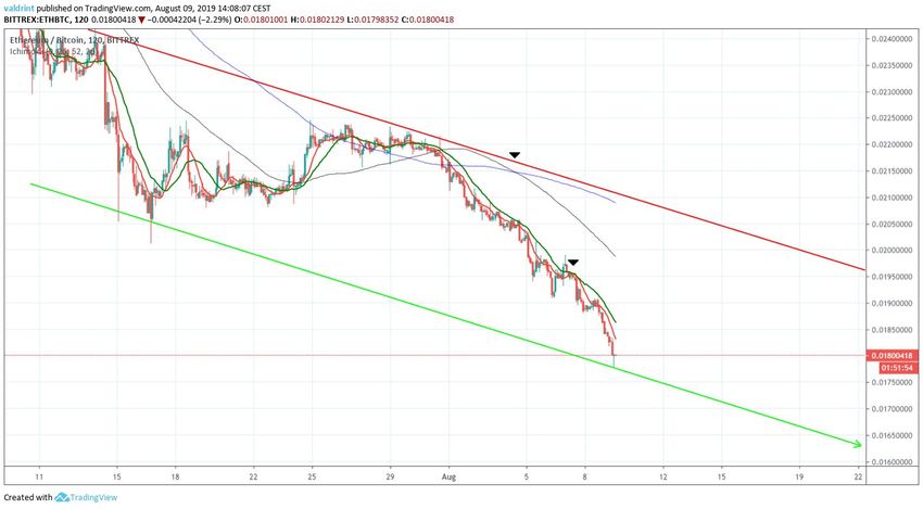 15 июля Ethereum отметил максимум ₿0.022, после чего предпринял несколько попыток тестирования этого уровня до 30 июля. Затем последовало снижение, которое продолжается до сих пор.