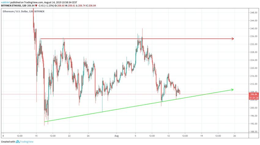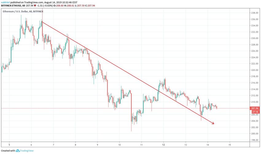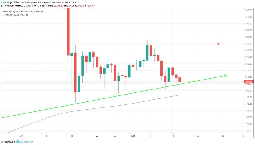 6 августа Ethereum отметил максимум $240, откуда начал развивать нисходящее движение. 10 августа ETH достиг минимума $201 и с тех пор растет.