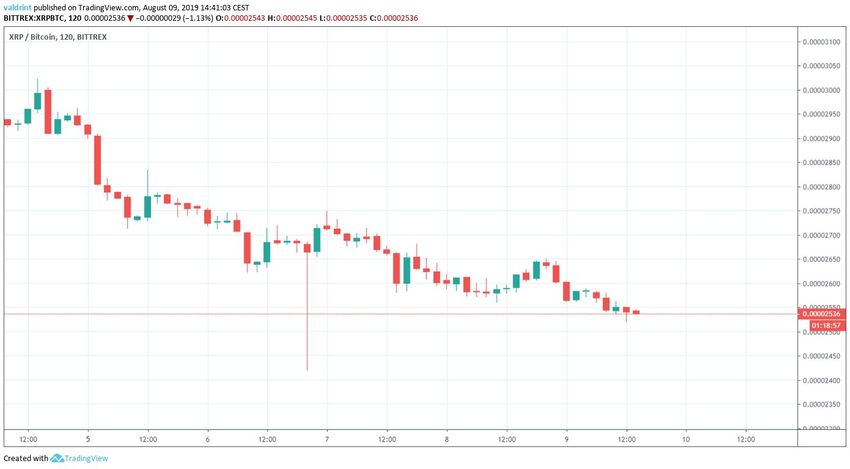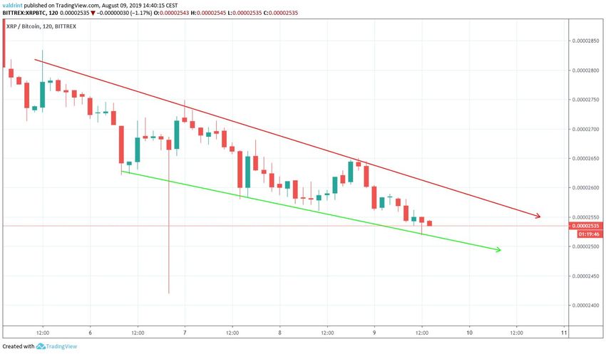 4 августа 2019 года курс XRP достиг максимума на 3053 сатоши, после чего пара начала отход на юг, чередуя фазы резкого падения и плавного снижения. За это время XRP сформировал несколько понижающихся минимумов.