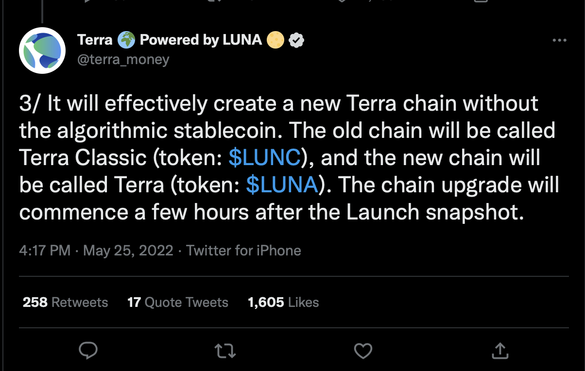 Судьба Terra Luna же будет зависеть от того, какое количество протоколов и команд разработчиков, которые работали на базе старого блокчейна Terra, будут доверять ему и продолжать создавать на нем приложения. Криптовалютные биржи и крупные инвесторы в настоящее время расходятся во мнениях относительно целесообразности поддержки блокчейна Terra 2.0.
