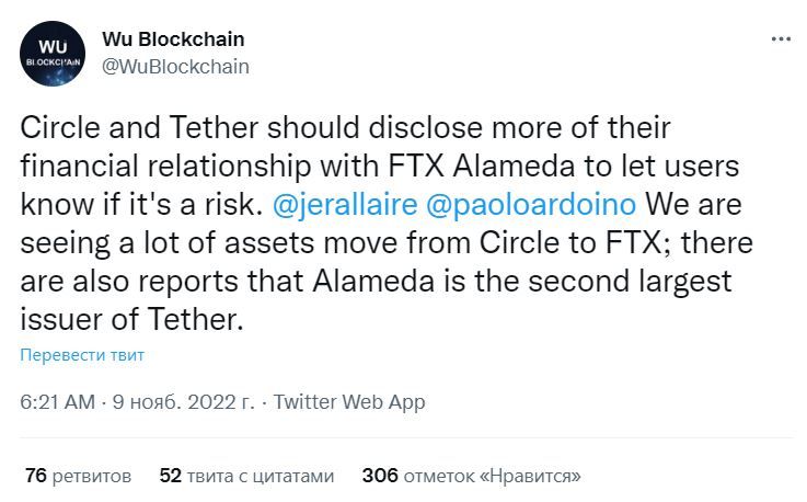 «Circle и Tether должны раскрыть больше информации о своих финансовых взаимоотношениях с FTX и Alameda, чтобы пользователи понимали уровень риска. Мы видим перемещение большого объема активов с Circle на криптобиржу FTX. Также есть информация о том, что Alameda – второй по величине эмитент стейблкоина Tether», — написал Колин Ву в своем микроблоге, отметив в сообщении CEO Circle Джереми Аллера и технического директора Tether Паоло Ардоино.