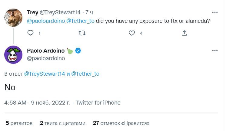 Одним из первых на претензии Коллина Ву ответил Паоло Ардоино. По его словам, компании, которые он представляет, никак не связаны с FTX или Alameda.