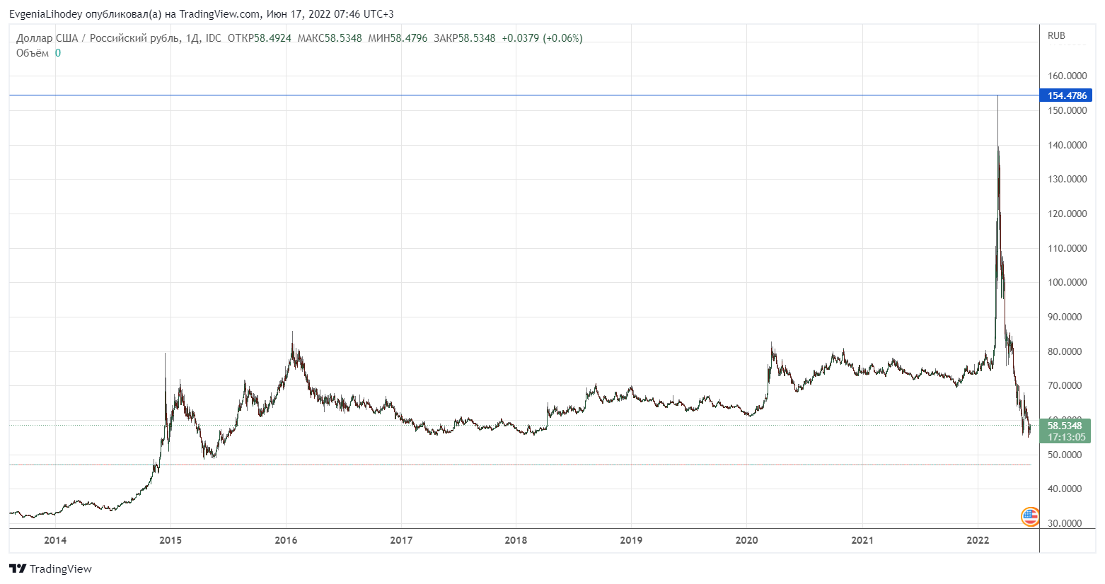 Валютные ограничения со стороны ЦБ дополнил укрепившийся рубль. В начале марта 2022 года на ряде торговых платформ национальная валюта РФ торговалась по ₽150/доллар США. Действия российских регуляторов способствовали укреплению рубля. К середине июня 2022 года национальная валюта закрепилась в диапазоне ₽55-57/доллар США.