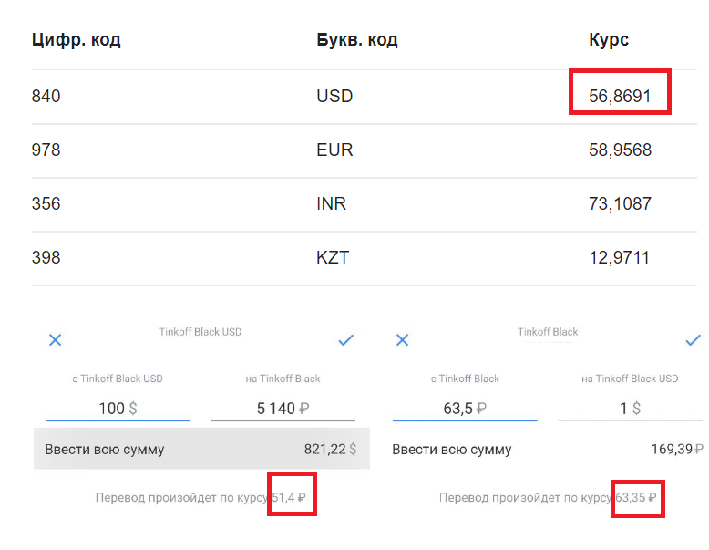- Желающих конвертировать валюту в рубли ждет неприятный курс. Например, по состоянию на момент написания обзора, официальный курс доллара, по данным ЦБ – 56,8 рублей. В тоже время «Тинькофф» предлагает обмен по 51 рублю за доллар. Купить доллары в банке, при этом, можно по 63 рубля.