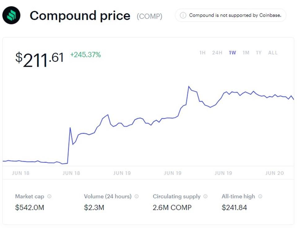 Всего за неделю стоимость криптовалюты Comp выросла с $60 за штуку до $200. Благодаря такому усиленному росту монета заняла 24 место в списке криптовалют, представленному ресурсом CoinMarketCup. Все это происходит на фоне стремительного падения биткоина.