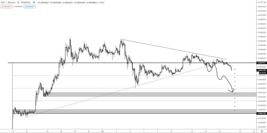 Криптовалютный трейдер @TheEurosniper поделился в твиттере графиком DOT и отметил, что пара, скорее всего, упадет в направлении уровня 32 500 сатоши.