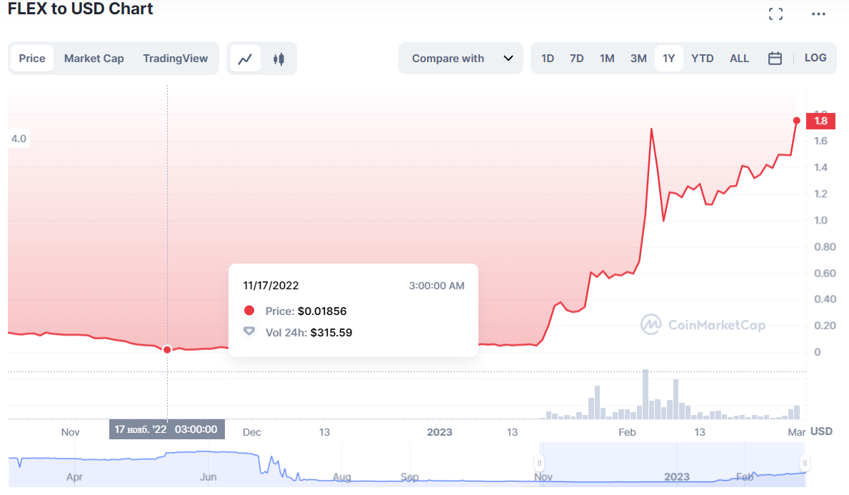 SponsoredПо данным CoinMarketCap, цена FLEX в ноябре прошлого года упала ниже $0,02. Однако в начале февраля курс токена в паре FLEX/USDT взлетел до $1,8 (почти 9000%). Что именно стало причиной столь резкого взлета котировок FLEX, неясно. Примечательно, что накрутка курса произошла на фоне сообщений в СМИ о сотрудничестве CoinFLEX со скандальными основателями 3AC в рамках нового проекта.