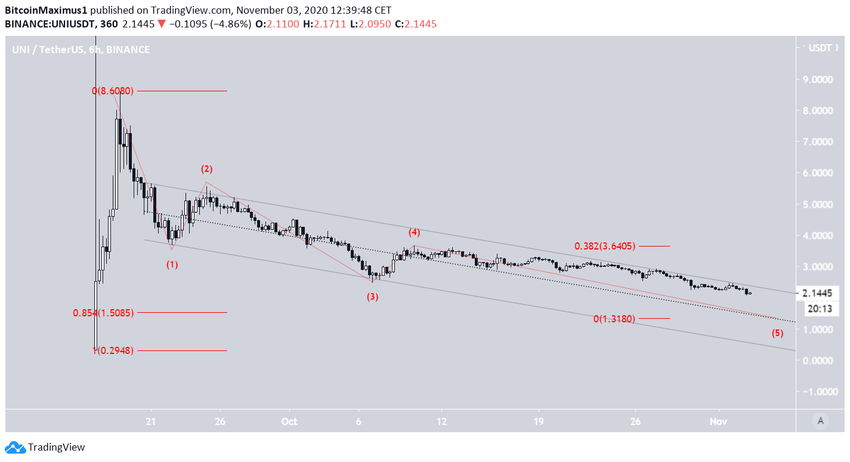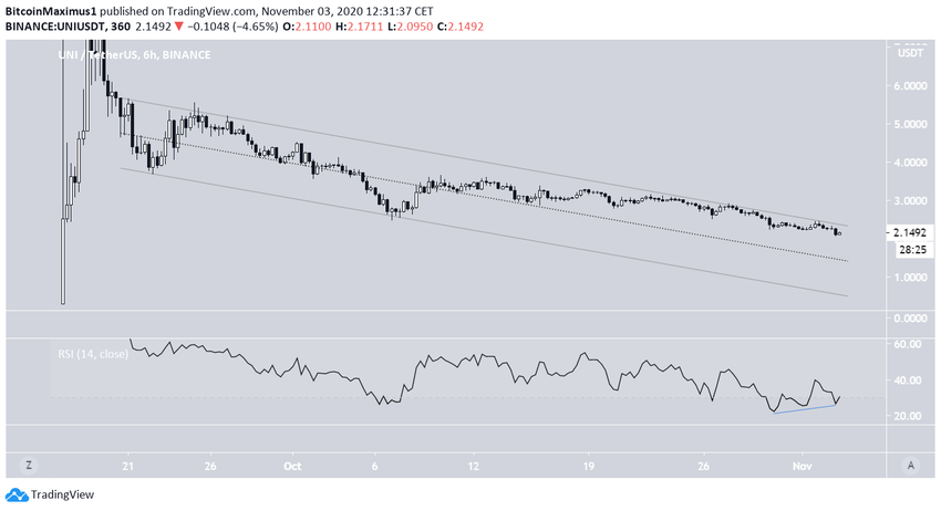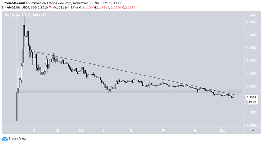 Далее на юг не наблюдается никаких горизонтальных уровней поддержки, за исключением области $0.30, откуда цена начала свой рост. Кроме того, UNI торгуется сейчас без какой-либо линии нисходящей поддержки.