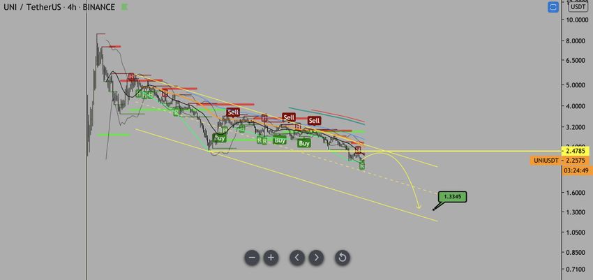 Криптовалютный трейдер @CryptoNewton поделился в Twitter графиком UNI, отметив, что цена торгуется внутри параллельного канала и может вскоре просесть к $1.53.