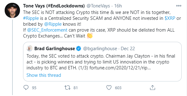 “SEC не атакует криптовалюты. В этом бизнесе мы не все в одной лодке. XRP – это централизованная мошенническая система. С этим никто не может поспорить. Если этот судебный процесс закончится в пользу SEC, XRP должен быть исключен из списка всех бирж криптовалют”, – написал он.