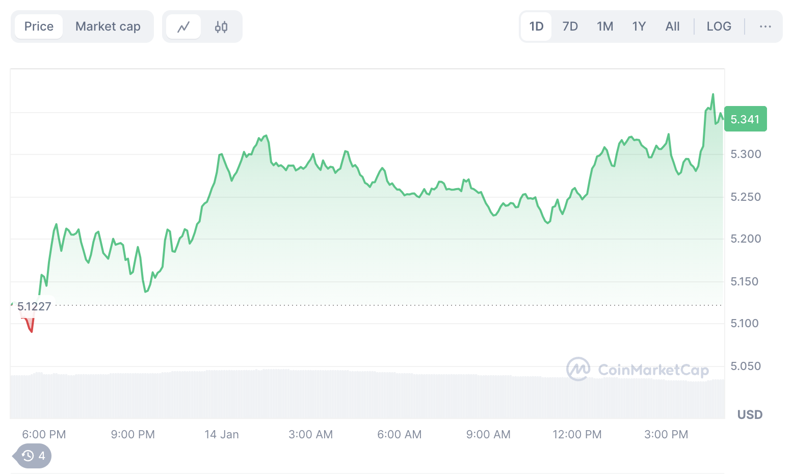 На фоне новости о расширении в США цена нативной монеты экосистемы The Open Network — Toncoin (TON) — поднялась более чем на 4%. По данным CoinMarketCap, на момент написания материала криптовалюта торгуется по $5,34.