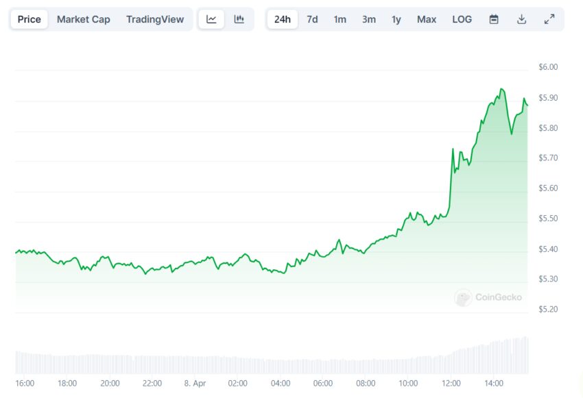 8 апреля курс Toncoin (TON) достиг отметки в $5,94, обновив исторический максимум. За последние сутки актив подорожал более чем на 8%