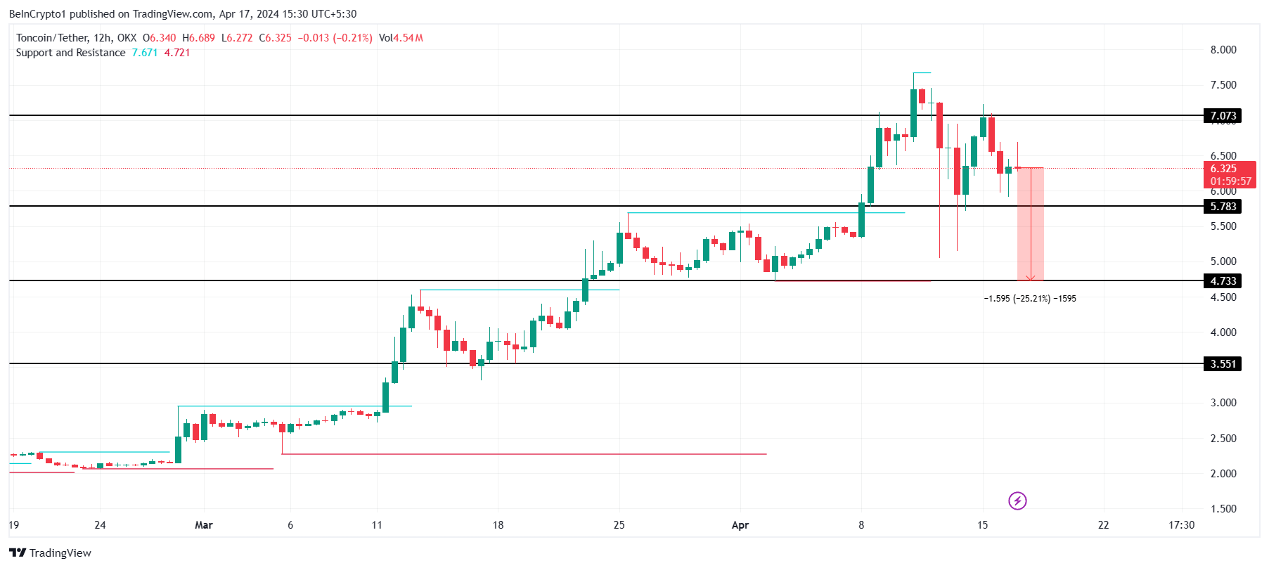 Если альткоин упадет, он протестирует уровень поддержки $5,7. Утрата этой отметки приведет к снижению TON до $4,7, что будет означать 25-процентную просадку цены.