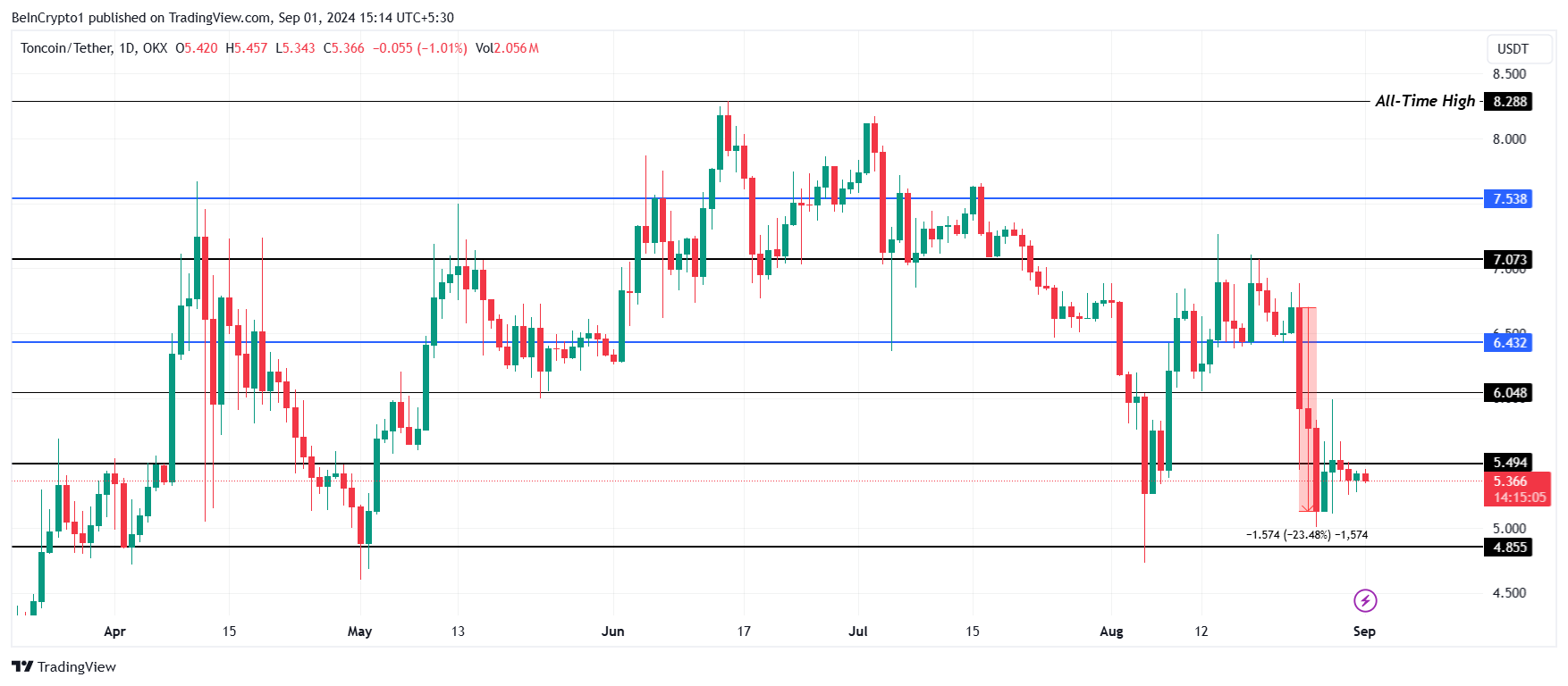 В настоящее время Toncoin торгуется на уровне $5,36, все еще не оправившись от 23-процентного обвала, произошедшего в конце августа. Несмотря на это, криптовалюта подает признаки жизни, пытаясь отвоевать недавние потери. Ключевой уровень сопротивления на отметке $5,49 сейчас имеет решающее значение, и преодоление этого барьера может открыть дверь для роста.