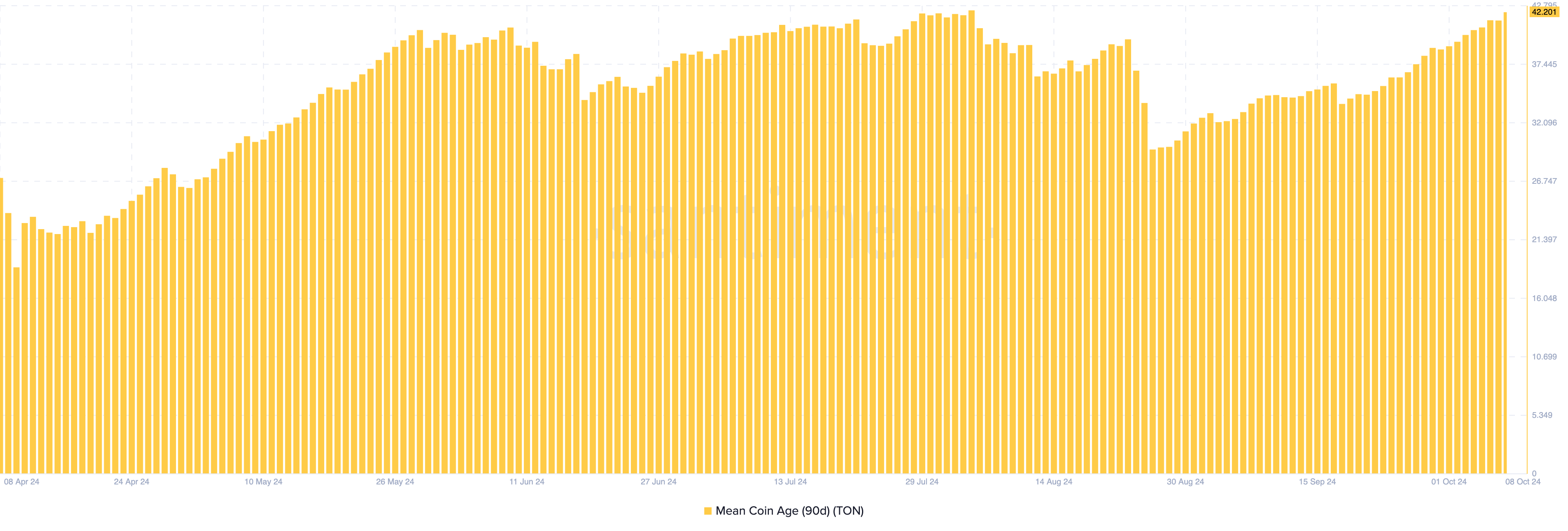 Кроме того, есть еще один фактор, мешающий цене Toncoin достичь $7. Это метрика среднего возраста вложенных средств в долларовом эквиваленте (MDIA). Показатель отслеживает, как долго ходлеры удерживают активы на кошельках. Рост его значений указывает на тенденцию к долгосрочному хранению. Снижение, напротив, обычно подтверждает активизацию долгосрочных держателей.