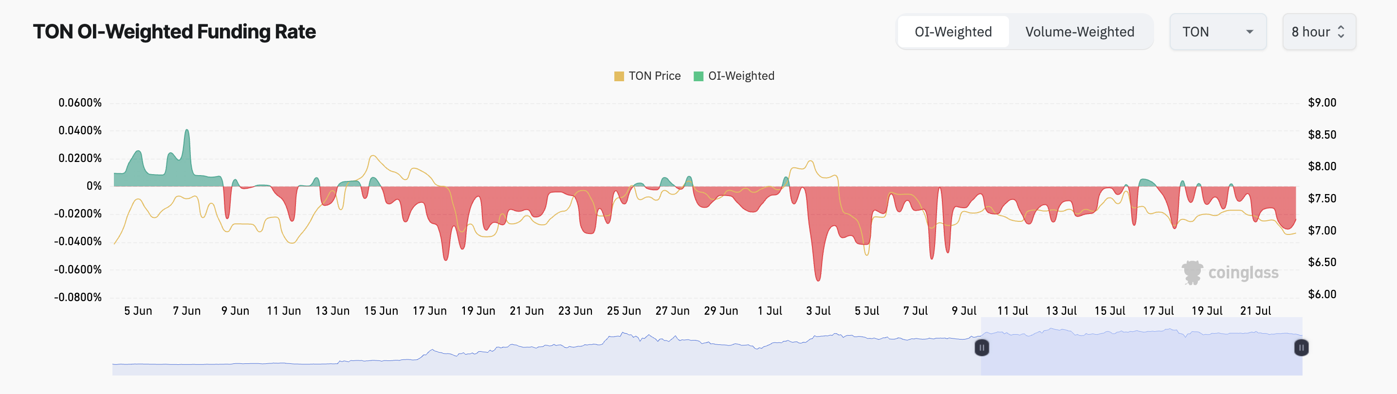 Затяжное падение TON также привело к тому, что трейдеры стали открывать все больше коротких фьючерсных позиций. Это видно по отрицательной ставке финансирования, которая составляет -0,023% с начала июля.
