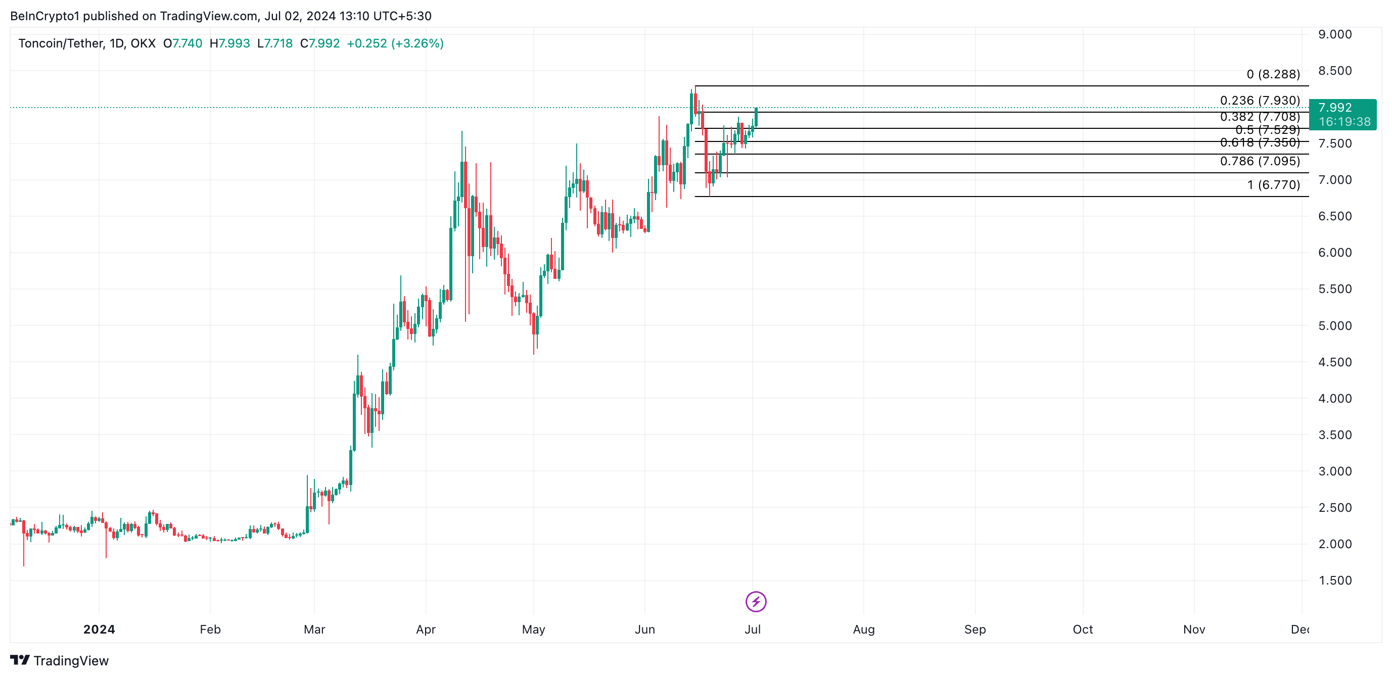 Медвежья дивергенция, когда цена актива растет, а индикатор CMF снижается, указывает на утрату восходящего импульса и на потенциально неподдерживаемый рост цены. Трейдеры воспринимают это как сигнал к возможному развороту. В случае коррекции цена TON рискует опуститься до $7,70.