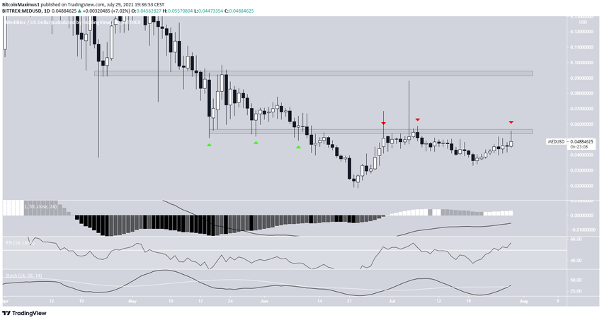 MED растет с 23 июня, 20 июля цена сформировала повышающийся минимум. Сейчас монета пытается преодолеть сопротивление $0,055. До 9 июня оно служило поддержкой, но затем трансформировалось в сопротивление.