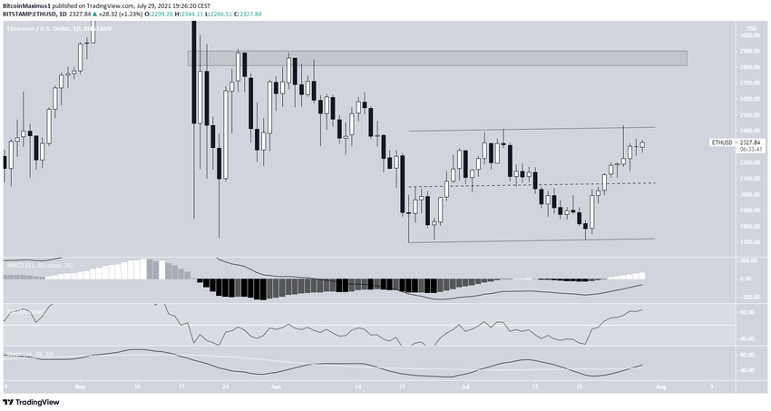 В настоящее время ETH торгуется внутри восходящего параллельного канала. Цена пытается подняться над верхней границей паттерна. Если ей это удастся, возможен рост к $2 850. Технические индикаторы на дневном интервале остаются бычьими.