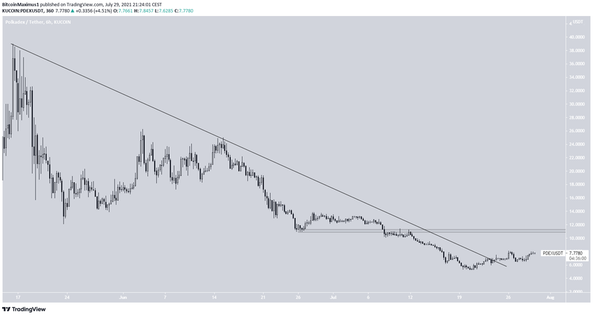 Токен растет с 20 июля, после достижения минимума на уровне $5,25. Несмотря на прорыв нисходящей линии сопротивления, цене еще предстоит преодолеть важную горизонтальную область $11.