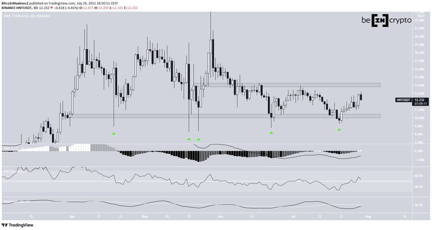 С начала апреля HNT пять раз отскакивал от горизонтальной области поддержки в районе $10,20. Технические индикаторы нейтральны с небольшим бычьим уклоном. Сопротивление находится на отметке $14,05.